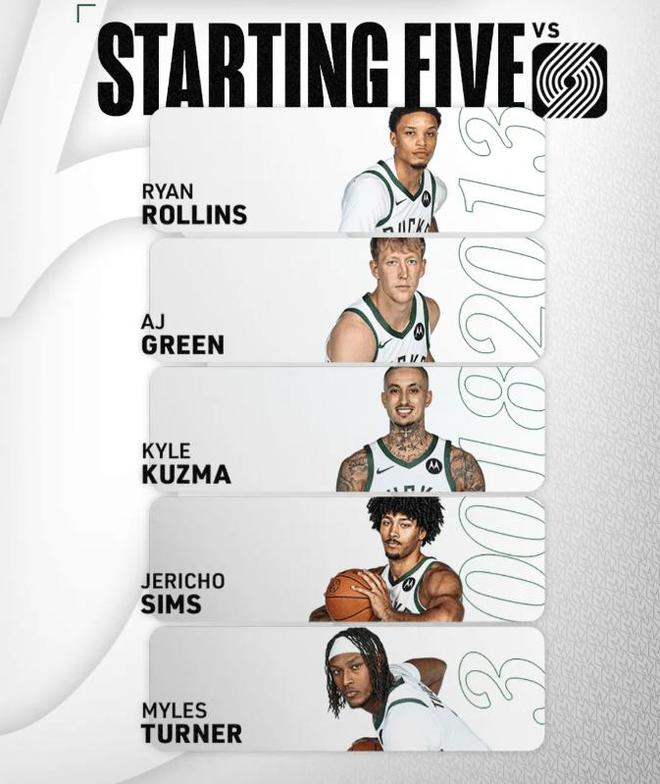 首发阵容方面,雄鹿队这边,字母哥因伤缺战,排出的最新首发五人组为:罗林斯、AJ-格林、库兹马、西姆斯、特纳;开拓者队这边,罗威迎来复出,首发阵容则为:德尼-阿夫迪亚、西迪-西索科、图马尼-卡马拉、杰拉米-格兰特、多诺万-克林根。